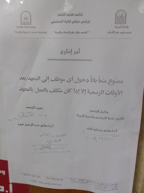 أمر إداري 28 March 2019 ممنوع منعا باتا دخول أي موظف إلى المعهد بعد أوقات العمل الرسمية إلا إذا كان مكلفا بالعمل بالمعهد