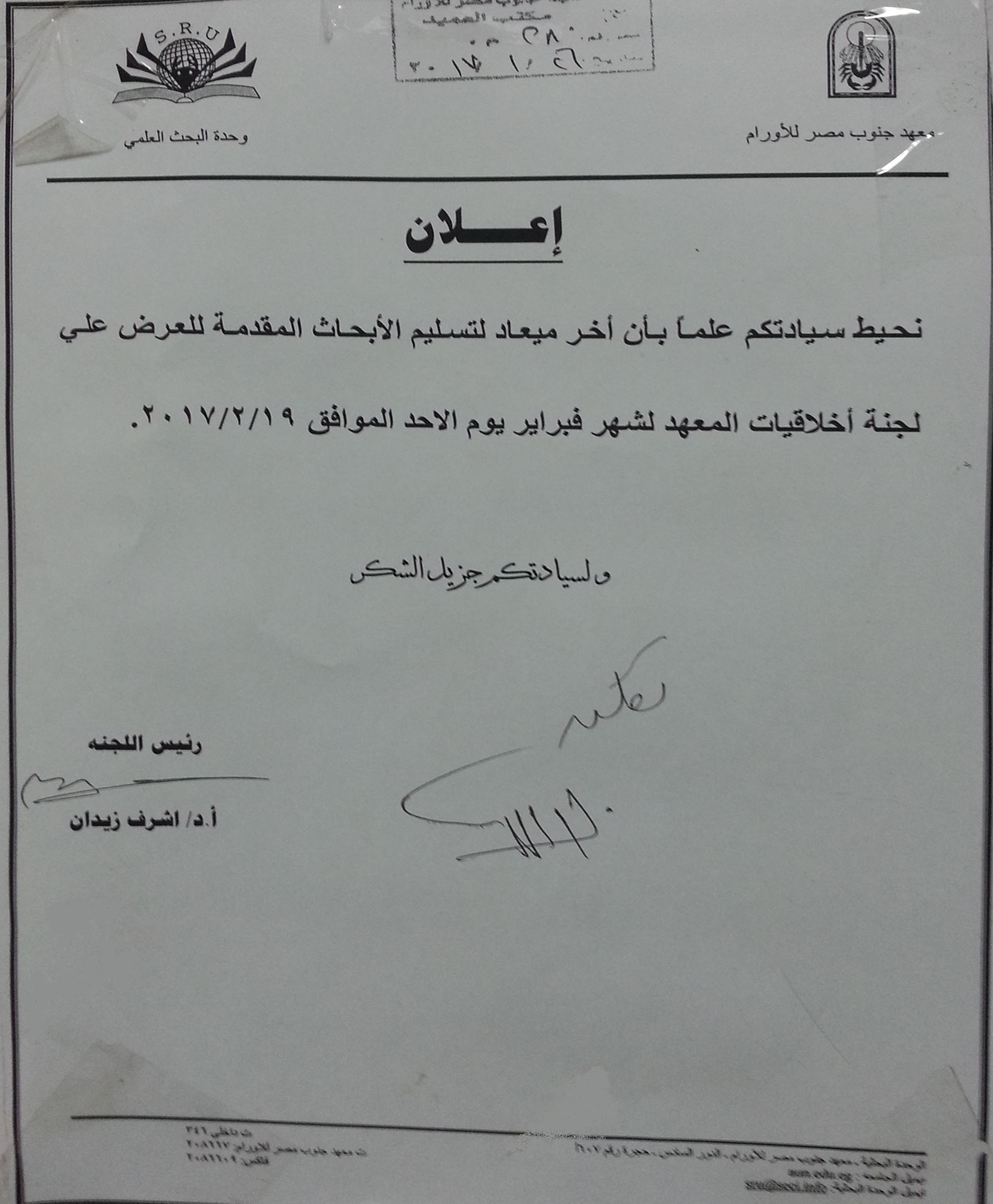 الموعد الأخير لتسليم أبحاث المقدمه للعرض على لجنة الأخلاقيات 14 فبراير 2017 نحيط سيادتكم علما بأن اخر موعد لتسلسم أبحاث لجنة الأخلاقيات هو يوم الأحد 19/2/2017