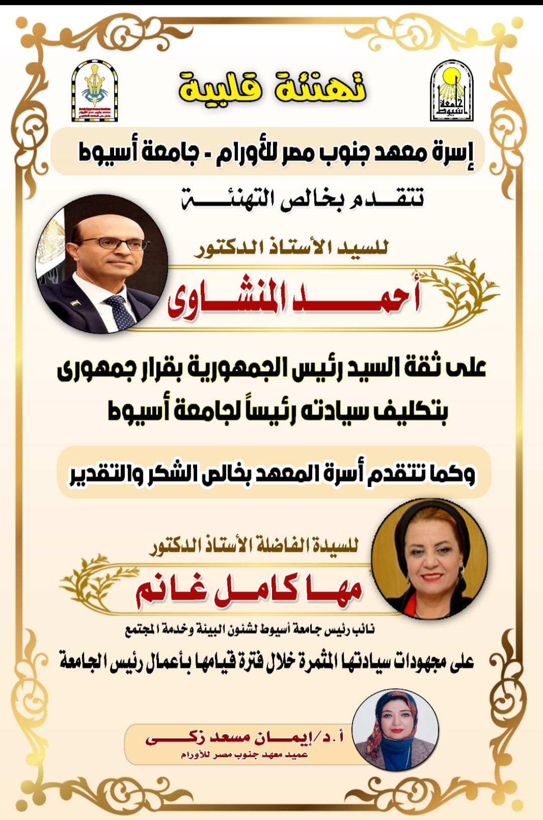 اسرة معهد جنوب مصر للأورام تتقدم بخالص التهنئة للسيد الاستاذ الدكتور / احمد المنشاوي لتولي سيادته رئيسا لجامعة أسيوط 10 فبراير 2023 اسرة معهد جنوب مصر للأورام تتقدم بخالص التهنئة للسيد الاستاذ الدكتور / احمد المنشاوي لتولي سيادته رئيسا لجامعة أسيوط.