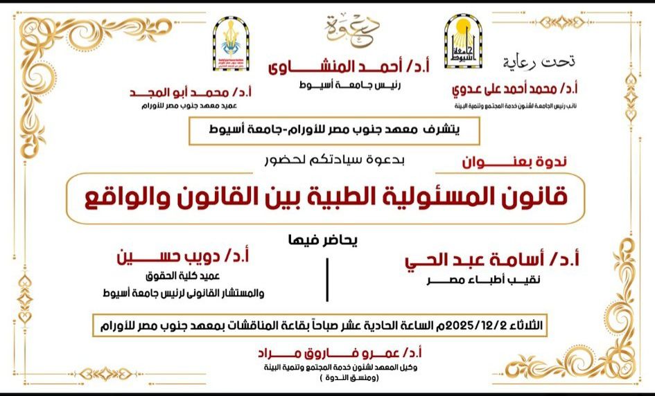 دعوة لحضور ندوة بعنوان " قانون المسؤلية الطبية بين القانون والواقع " بمعهد جنوب مصر للأورام 27 نوفمبر 2025