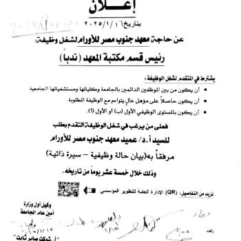 إعلان عن حاجة المعهد لرئيس قسم مكتبة المعهد وفقا للإعلان المرفق