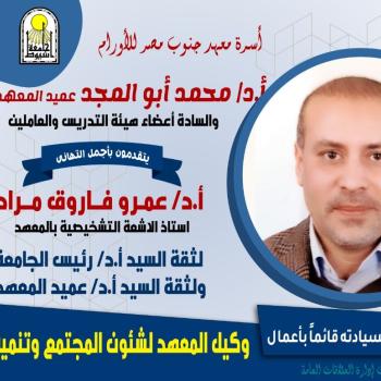تهنئة مقدمة من السيد أ.د/محمد ابوالمجد عميد المعهد وأعضاء هيئة التدريس والعاملين بتجديد تكليف الدكتور عمرو فاروق مراد، للقيام بأعمال وكيل المعهد لشئون خدمة المجتمع وتنمية البيئة