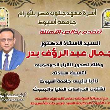 تهنئة للسيد الاستاذ الدكتور / جمال عبدالرؤف بدر لتعيين سيادته نائبا لرئيس جامعة أسيوط لشئون الدراسات العليا والبحوث