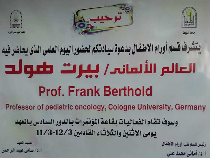 يتشرف قسم طب اورام الاطفال بدعوة سيادتكم لحضور اليوم العالمي الذي يحاضر فية العالم الألماني / بيرت هولد يومي الاثنين والثلاثاء 11 , 12 / 3/2019