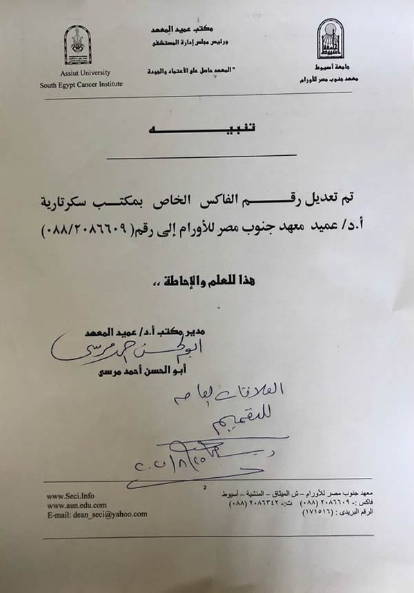 تم تغيير رقم الفاكس الخاص بمكتب أ.د/ عميد المعهد ليصبح