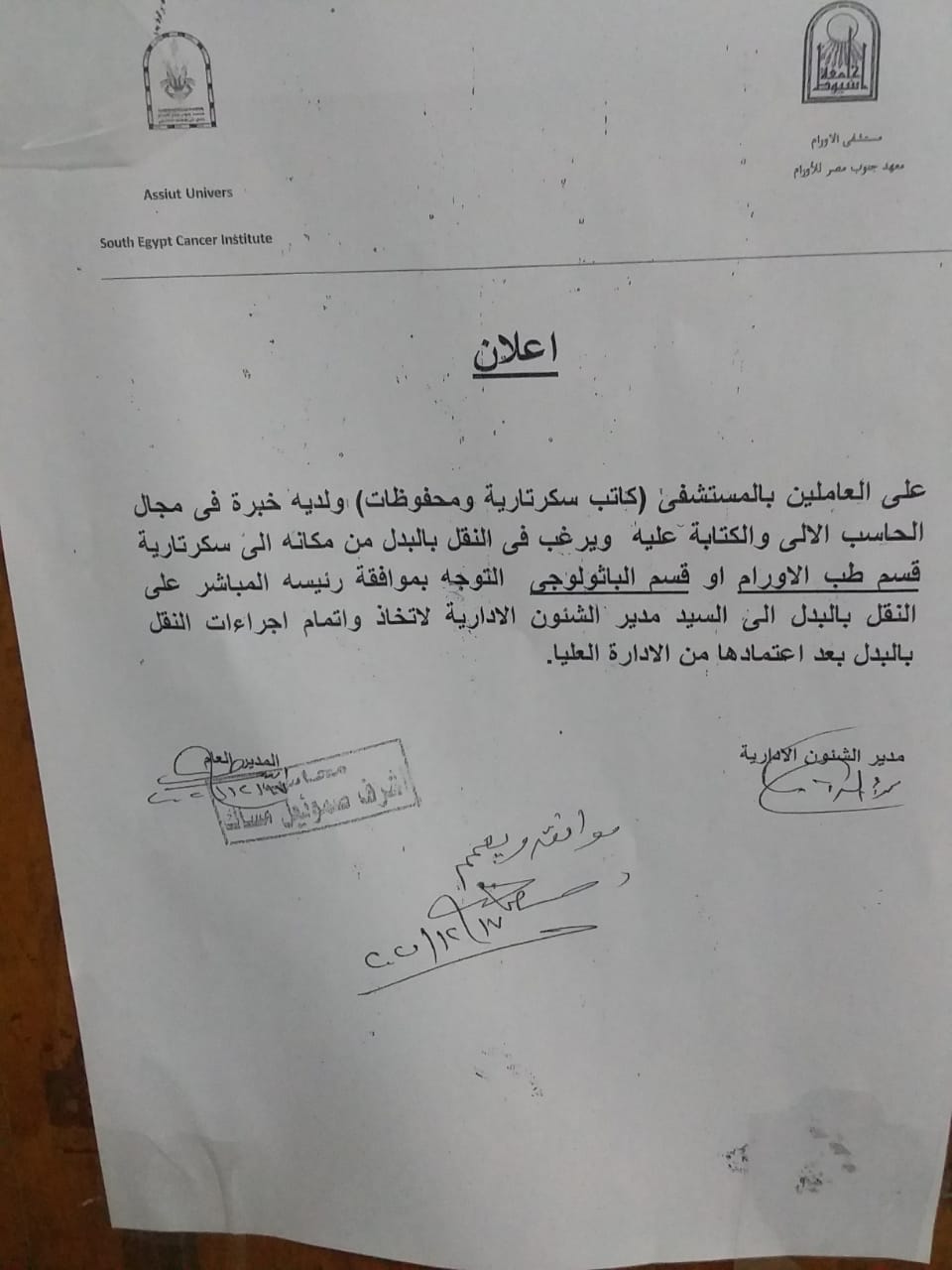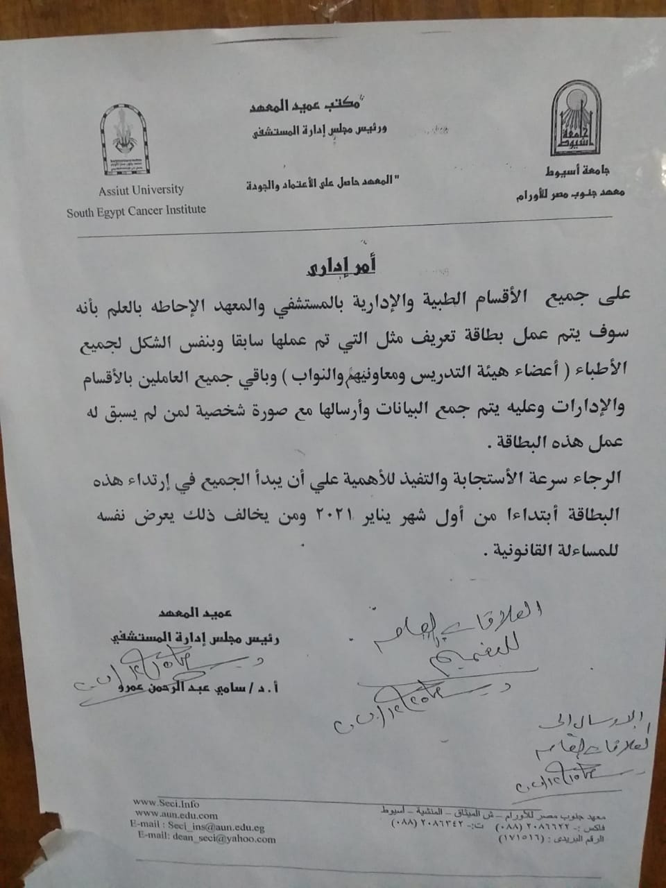 أصدر الدكتور طارق الجمال رئيس جامعة أسيوط عدة قرارات في عدد من كليات الجامعة , والتي شملت في معهد جنوب مصر للأورام تولى الأستاذ الدكتور سامي عبد الرحمن عمرو عرفان الإشراف على المعهد لحين تعيين عميدا للمعهد .
