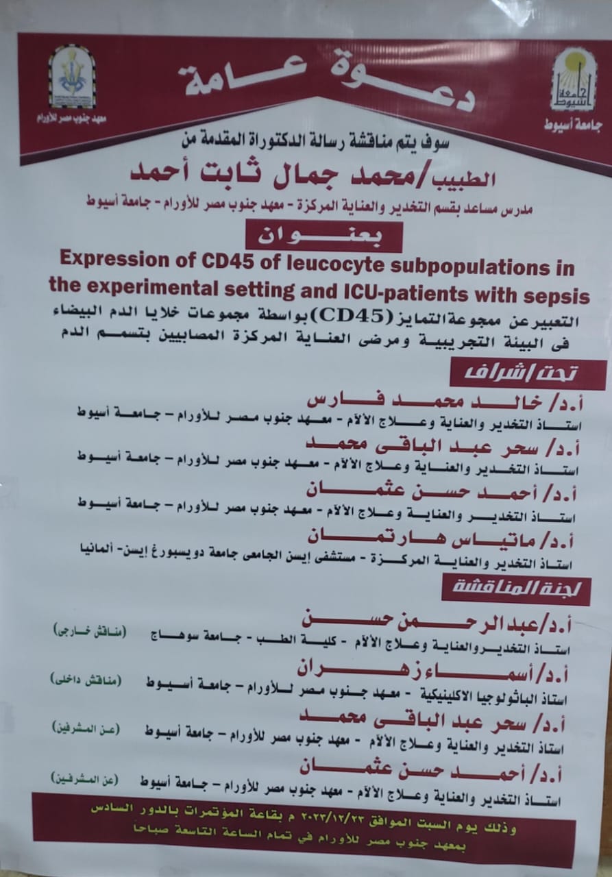 مناقشة رسالة الدكتوراة المقدمة من الطبيب / محمد جمال ثابت احمد