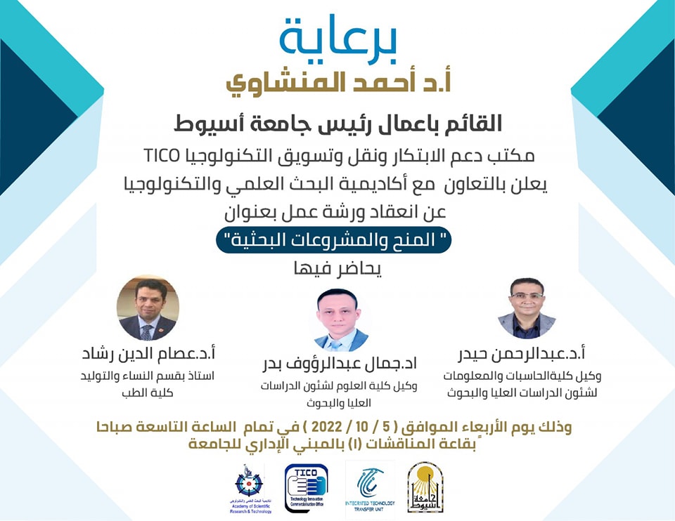 برعاية الاستاذ الدكتور أحمد المنشاوي القائم بأعمال رئيس جامعة أسيوط يتشرف مكتب دعم الابتكار ونقل وتسويق التكنولوجيا (TICO) بجامعة أسيوط بعقد ورشة عمل بعنوان