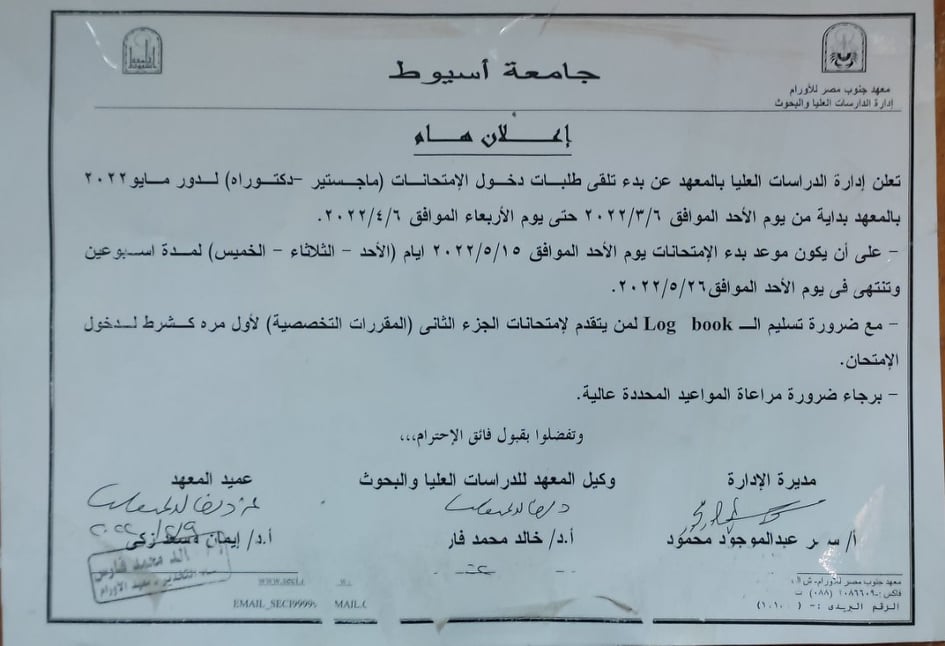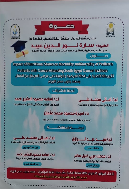 وذلك تحت قيادة الأستاذ الدكتور طارق الجمال رئيس الجامعة والأستاذة الدكتورة إيمان مسعد زكي عميد معهد جنوب مصر للأورام ، الهيئة العامة للاعتماد والرقابة الصحية (GAHAR) تسجل معامل مستشفي الأورام الجامعي معهد جنوب مصر للأورام جامعة أسيوط