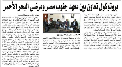 تفعيل بروتوكول التعاون بين معهد جنوب مصر للأورام بجامعة أسيوط ومديرية الشؤون الصحية بالبحر الأحمر 17 يوليو 2016 تفعيل بروتوكول التعاون بين معهد جنوب مصر للأورام بجامعة أسيوط ومديرية الشؤون الصحية بالبحر الأحمر