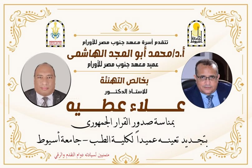 تتقدم اسرة معهد جنوب مصر للأورام بخالص التهنئة للاستاذ الدكتور / علاء عطية بمناسبة صدور القرار الجمهوري بتجديد تعيين سيادته عميداً لكلية الطب 18 سبتمبر 2025