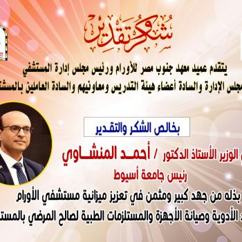 شكر وتقدير من السيد الاستاذ الدكتور / خالد محمد فارس القائم بعمل عميد المعهد والسادة أعضاء هيئة التدريس ومعاونيهم والعاملين للسيد الأستاذ الدكتور رئيس جامعة أسيوط لتعزيز…