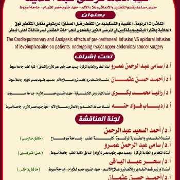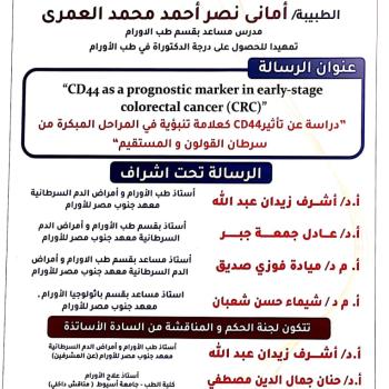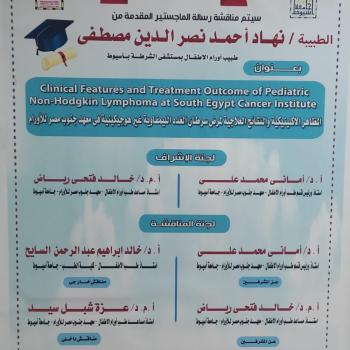 دعوة لحضور مناقشة رسالة الماجستير المقدمة من الطبيبة / نهاد احمد نصر الدين بعنوان " المظاهر الاكلينيكية والنتائج العلاجية لمرض سرطان الغدد الليمفاوية غير هوجيكينية في معهد جنوب مصر للأورام