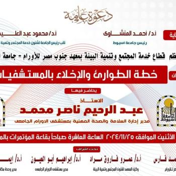 ينظم قطاع خدمة المجتمع وتنمية البيئة بمعهد جنوب مصر للأورا م محاضرة بعنوان / خطة الطوارئ والإخلاء بالمستشفيات
