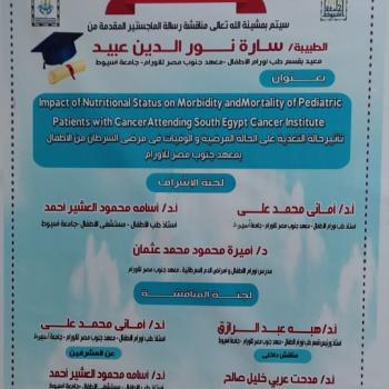 مناقشة رسالة الماجستير المقدمة من الطبيبة / سارة نورالدين عبيد