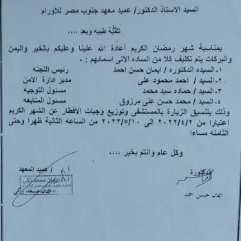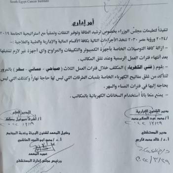 تعليمات خاصة بترشيد الطاقة وتوفير النفقات بكافة الأقسام المالية والإدارية والطبية والعلاجية بمعهد جنوب مصر للأورام