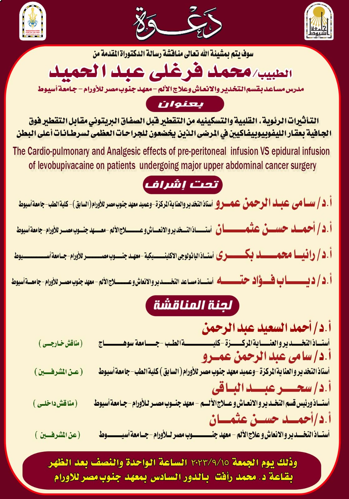دعوة لحضور مناقشة رسالة الدكتوراة للطبيب / محمد فرغلي عبدالحميد المدرس المساعد بقسم التخدير والانعاش وعلاج الألم
