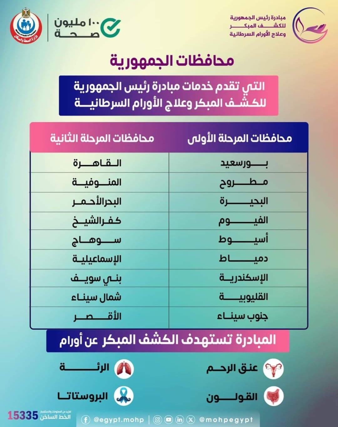 تعرف على محافظات الجمهورية التي تقدم خدمات مبادرة السيد رئيس الجمهورية للكشف المبكر وعلاج الاورام السرطانية 15 ديسمبر 2023 تعرف على محافظات الجمهورية التي تقدم خدمات مبادرة السيد رئيس الجمهورية للكشف المبكر وعلاج الاورام السرطانية