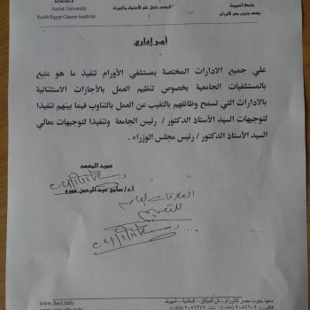 Congratulations presented by the administration of the South Egypt Cancer Institute to Dr. Asmaa Zahran, receiving the Encouragement Award for Scientific Excellence at Assiut University