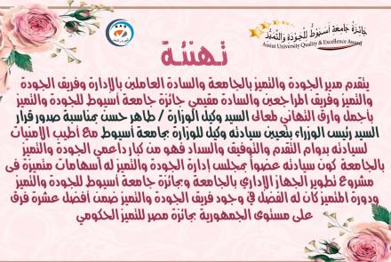 تعلن جائزة التميز الحكومى احتلال جامعة أسيوط مكانة متقدمة بين افضل عشر مراكز على مستوى الجمهورية فى ثلاث جوائز مختلفة