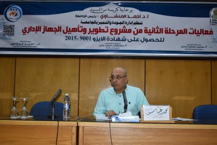 برعاية كريمة من السيد أ.د/ احمد المنشاوي – رئيس الجامعة استمراراً لفعاليات الجودة والتميز ومشروع تطوير الجهاز الإداري بالجامعة 2022
