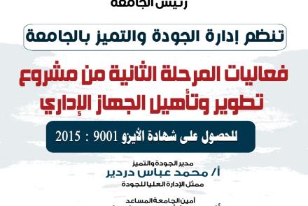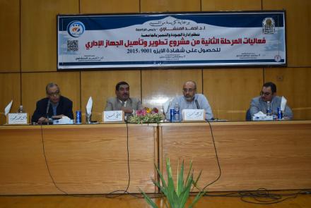 انطلاق فعاليات الجودة والتميز ومشروع تطوير الجهاز الإداري بالجامعة بمركز المؤتمرات بالمبنى الإداري