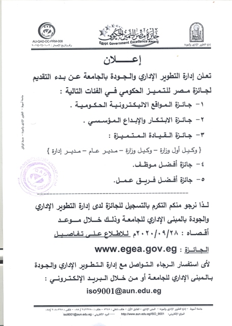 لـــذا نرجو منكم التكرم بالتسجيل للجائزة لدى إدارة التطوير الإداري والجودة بالمبنى الإداري للجامعــة وذلـــك خـــــلال مــــــوعــــد أقـــصــــاه : 28/09/2020م لــلاطـــلاع عـــلـــى تــفــاصــــيـــل الــجـــائــــزة : www.egea.gov.eg