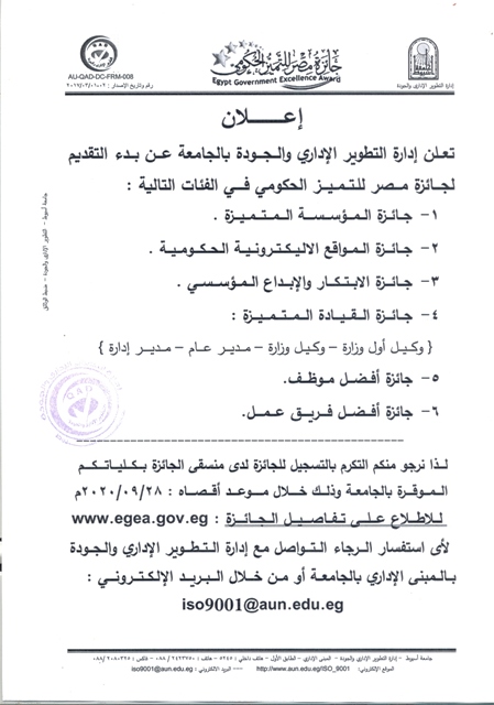 تعــلن إدارة التطوير الإداري والــجـــودة بالجامعة عـــن بــدء التقديم لجـــائزة مـــصر للـتــمــيـــز الحكومي فــــي الفئات التالية :