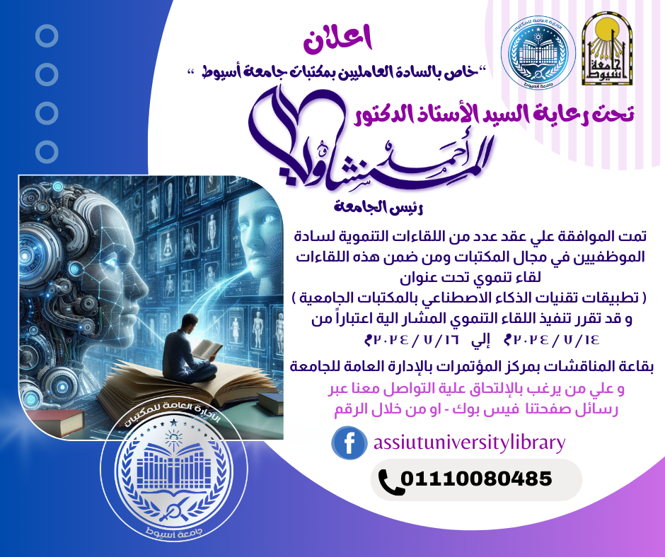 #اعلان " خاص بالسادة العاملين بمكتبات جامعة أسيوط " لقاء تنموي #تطبيقات_تقنيات_الذكاء_الاصطناعي_بالمكتبات_الجامعية الإدارة العامة للمكتبات الجامعية - جامعة أسيوط للتواصل الرجاء الاتصال علي : 01110080485 26 يونيو 2024