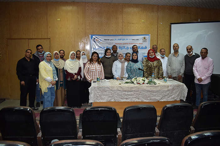 فريق الجودة والتميز وبحضور لفيف من السادة أعضاء هيئة التدريس ومديري الإدارات والعاملين بالكلية تم وبدء اللقاء بتقديم السيد/ سيد حسن محمد عرض توضيحي وشرح الجوائز وآليات التقدم وسبل الدعم الفني ثم قام بالرد على استفسارات السادة أعضاء هيئة التدريس والعاملين بالكلية، وحضر اللقاء فريق الجودة والتميز بالجامعة كلا من