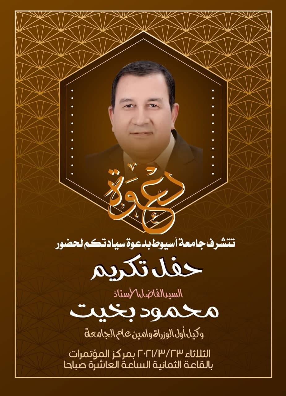 تكريم الاستاذ محمود سيد بخيت امين عام جامعه اسيوط 23 مارس 2021 دعـــــوة تتشرف جامعة أسيوط بدعوة سيادتكم لحضور حفل تكريم الأستاذ محمود بخيت وكيل اول الوزارة وأمين عام جامعة أسيوط وذالك يوم الثلاثاء الموافق 23/3/2021 بمركز المؤتمرات بالقاعة الثمانية الساعة العاشرة صباحا