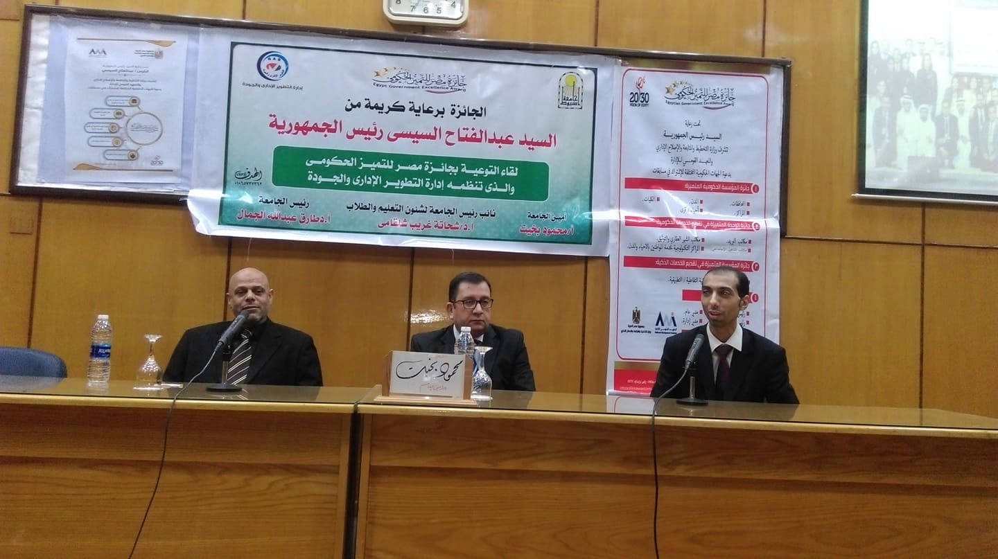 نظمت إدارة التطوير الادارى والجودة بالتعاون مع وزارة التخطيط والمتابعة والاصلاح الادارى ووزارة التعليم العالى والمعهد القومى للادارة التدريبى الخاص بجائزة مصر للتميز الحكومى فى رحاب جامعة اسيوط وذلك يوم الثلاثاء الموافق 12/02/2019 الساعة التاسعة بقاعة المناقشات رقم (2) وبحضور السيد/ مصطفى عبد الستار مدير جائزة المؤسسة المتميزة ، والاستاذ الدكتور / عبدالحكيم رضوان سعيد مدرب بجائزة مصر للتميز الحكومى افتتح اللقاء السيد وكيل اول الوزارة الاستاذ / محمود سيد بخيت أمين الجامعة والمشرف على فعاليات جائزة مصر للتميز الحكومى وممثلى الإدارة العليا للجودة بالجامعة وبحضور ممثلى الكليات واستضافة الجامعة ايضاً ممثلى جامعة سوهاج حيث رحب سيادته بضيوف الجامعة الكرام و اوضح سيادة الامين اهمية المشاركة فى الجائزة ودور الجامعة فى الحصول على احدى الجوائز واهمية العمل الالكترونى وتطوير الجهاز الادارى الكترونياً ، واكمل سيادة الامين شرح الجائزة و شروطها وآليات التقديم ومواعيدها والاوراق والمستندات المطلوبة ، وأشار إلى أن المشاركة إجبارية لكافة المؤسسات الحكومية