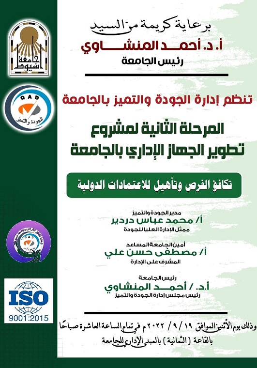 يدشن معالى السيد أ.د/ أحمد المنشاوى رئيس الجامعة غداً الاثنين الموافق 19 سبتمبرالمرحلة الثانية من مشروع تطوير الجهاز الإدارى بالجامعة والتى تشمل تأهيل 14 كلية و 13 إدارة عامة وفرعية للحصول على شهادة الأيزو 9001 لسنة 2015.