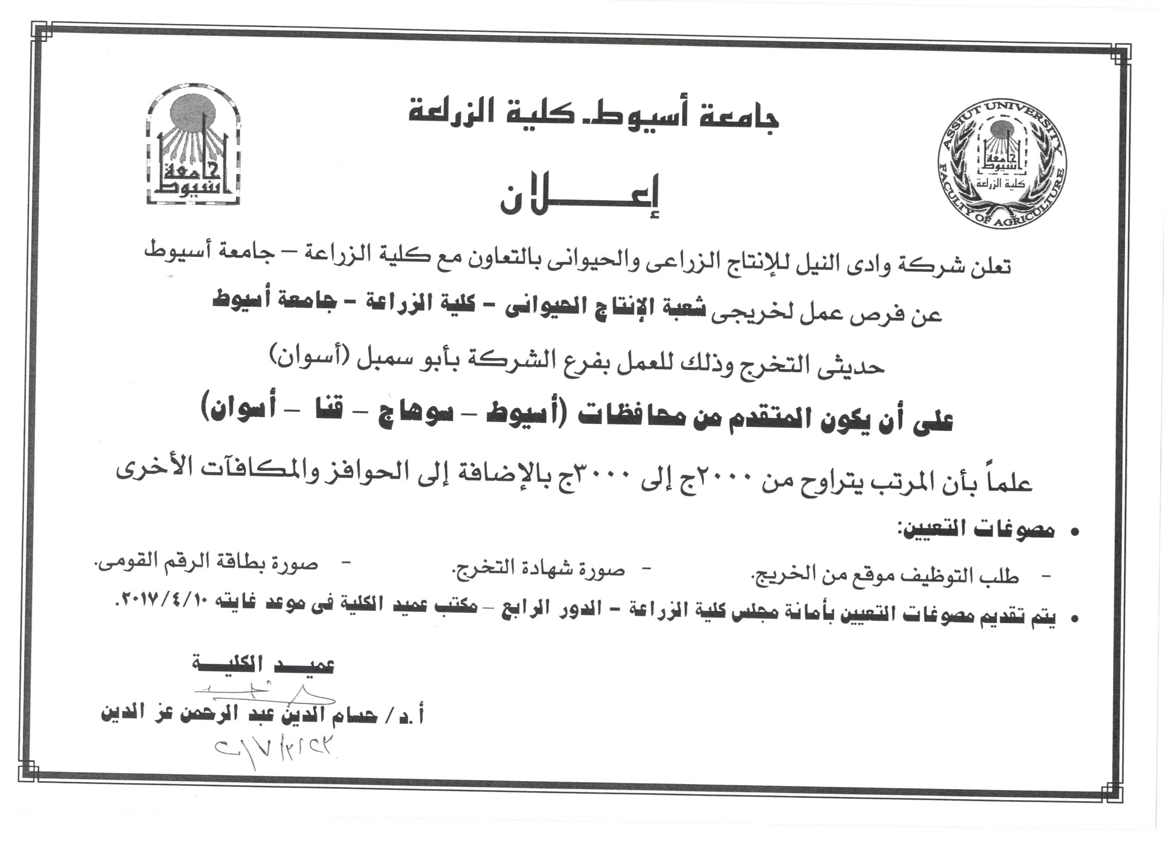 إعلان عن فرص عمل بشركة وادى النيل لانتاج الزراعى والحيوانى 23 مارس 2017 إعلان عن فرص عمل بشركة وادى النيل لانتاج الزراعى والحيوانى