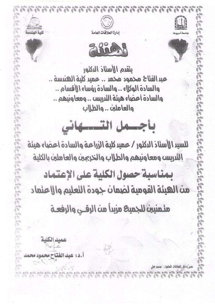 الأستاذ الدكتور عميد كلية الهندسة و السادة الوكلاء يتقدمون بخالص التهنئة لكلية الزراعة 8 يونيو 2013 الأستاذ الدكتور عميد كلية الهندسة و السادة الوكلاء يتقدمون بخالص التهنئة لكلية الزراعة