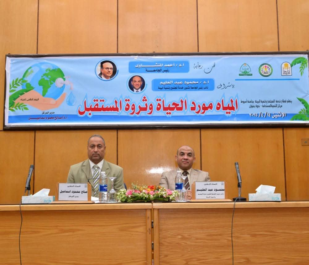 نظّم مركز التنمية المستدامة بجامعة أسيوط، والتابع لقطاع شئون خدمة المجتمع وتنمية البيئة، تحت رعاية الدكتور أحمد المنشاوي، رئيس الجامعة، ندوة توعوية بعنوان "المياه مورد الحياة وثروة المستقبل"، وذلك احتفالاً باليوم العالمي للمياه، تحت إشراف الدكتور محمود عبد العليم، نائب رئيس الجامعة لشئون خدمة المجتمع وتنمية البيئة، والدكتور صالح محمود إسماعيل، مدير مركز التنمية المستدامة، وبحضور أعضاء مجلس إدارة المركز، وعمداء ووكلاء الكليات، وأعضاء هيئة التدريس، والهيئة المعاونة، والعاملين والباحثين بالجامعة، ونخبة من المشاركين بجامعة أسيوط الجديدة التكنولوجية، وممثلين عن عدد من الجمعيات الخيرية العاملة في مجال المياه.