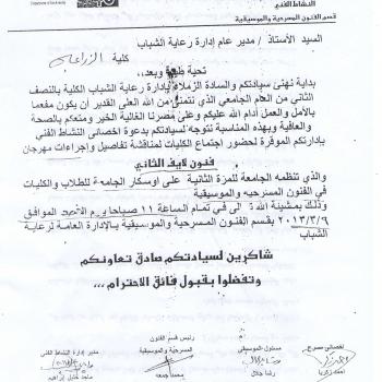 تتشرف الإدارة العامة لرعاية الشباب بدعوة اخصائى النشاط الفنى بالكلية لحضور اجتماع الكليات لمناقشة تفاصيل وإجراءات مهرجان فنون لايف الثانى والذى تنظمه الجامعة للمرة الثانية على أوسكار الجامعة للطلاب…