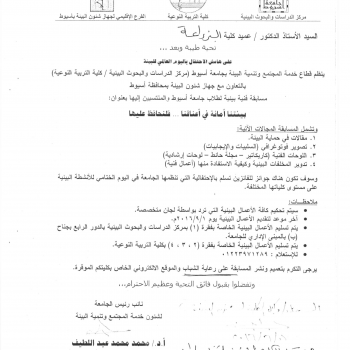 على هامش الاحتفال بيوم البيئة العالمى وذلك تحت رعاية الدكتور احمد عبده جعيص رئيس الجامعة أعلن قطاع خدمة المجتمع وتنميه البيئة بالجامعة – مركز دراسات والبحوث البيئة وكليه التربية النوعية- مسابقة…
