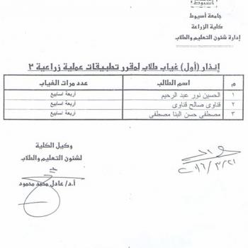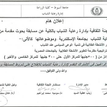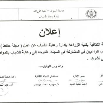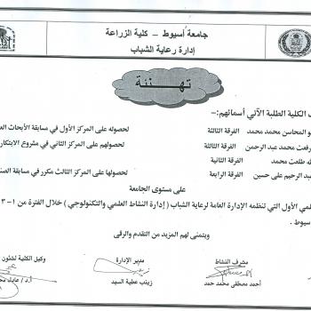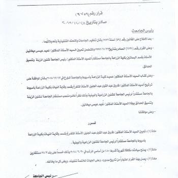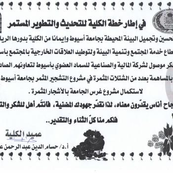 بقسم وقاية النبات بكلية الزراعة جامعة أسيوط بتعين سيادته مستشارا ورئيسا للشئون الزراعية والبيئية