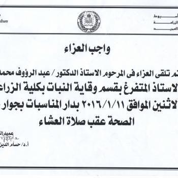 الاستاذ المتفرغ بقسم وقاية النبات بكلية الزراعة وذلك يوم الاثنين الموافق 2016/1/11