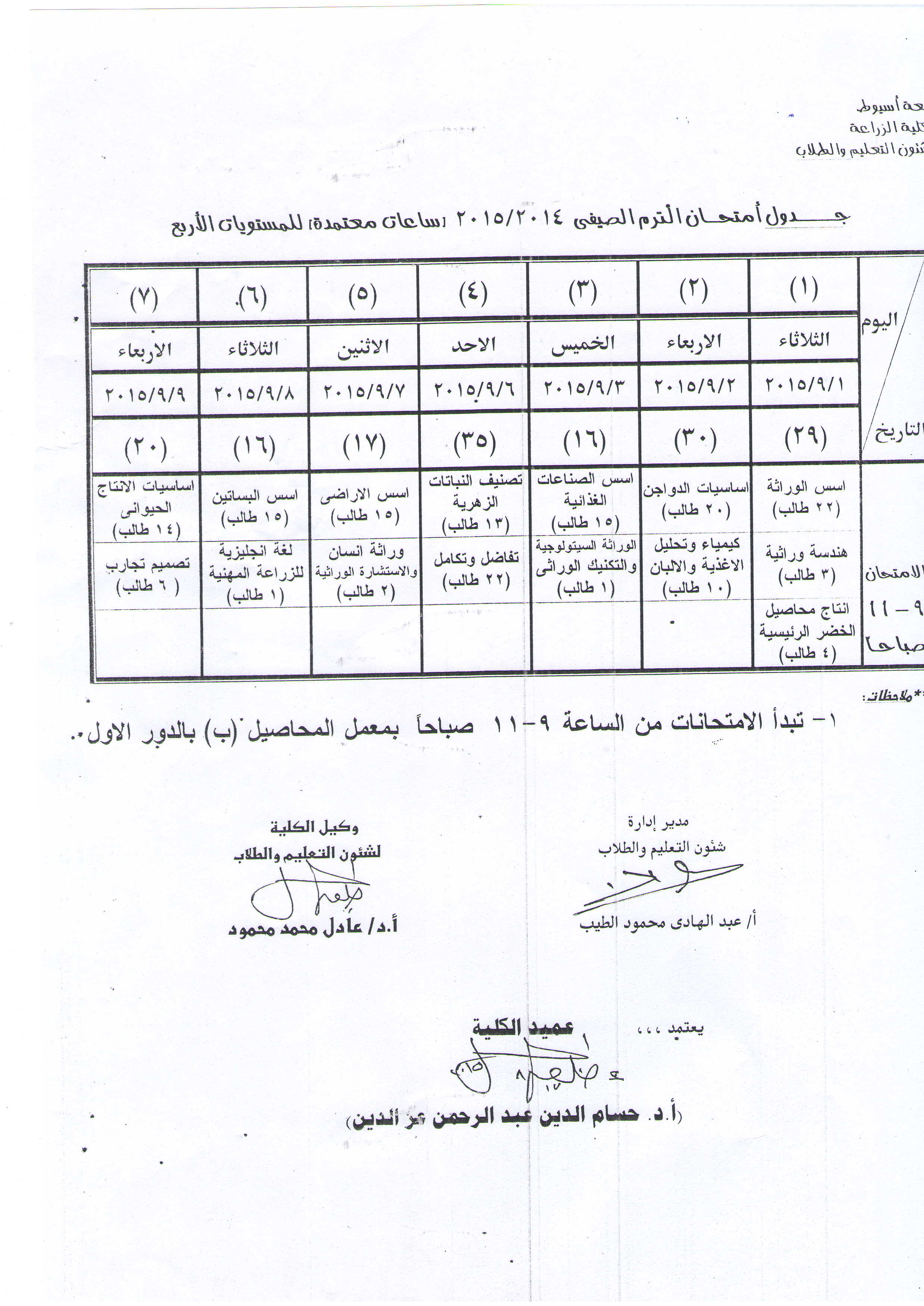 جدول امتحان الترم الصيفى 2015/2014