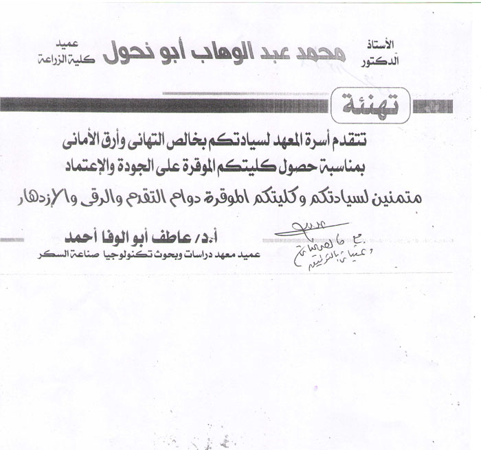 عميد معهد دراسات و بحوث تكنولوجيا صناعة السكر يهنئ كلية الزراعة 11 يونيو 2013 عميد معهد دراسات و بحوث تكنولوجيا صناعة السكر يهنئ كلية الزراعة