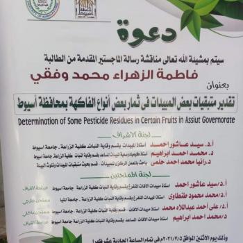 تم اليوم التوصية بمنح الطالبة فاطمة الزهراء محمد وفقي درجة الماجستير في العلوم الزراعية - وقاية نبات .