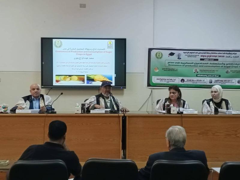 وقد أُقيمت المناقشة صباح الثلاثاء 28 أبريل 2026 بقاعة الاستاذ الدكتور عبد المجيد ابو المجد – كلية الزراعة بجامعةأسيوط، وسط حضور عدد من أعضاء هيئة التدريس والباحثين ، حيث أشادت اللجنة بجهد الباحث وأهمية الدراسة في دعم قطاع المحاصيل السكرية في مصر.