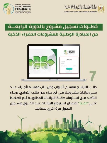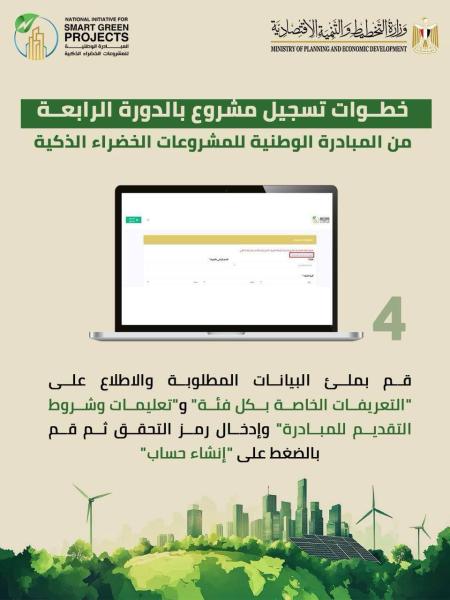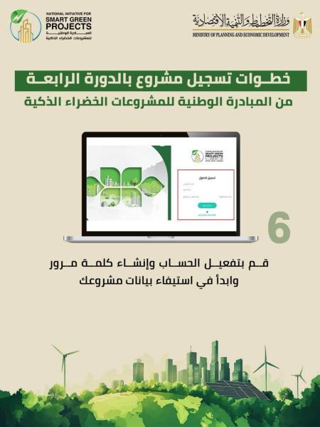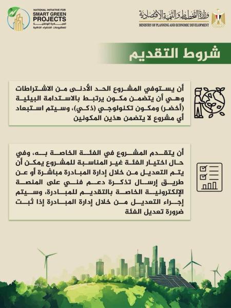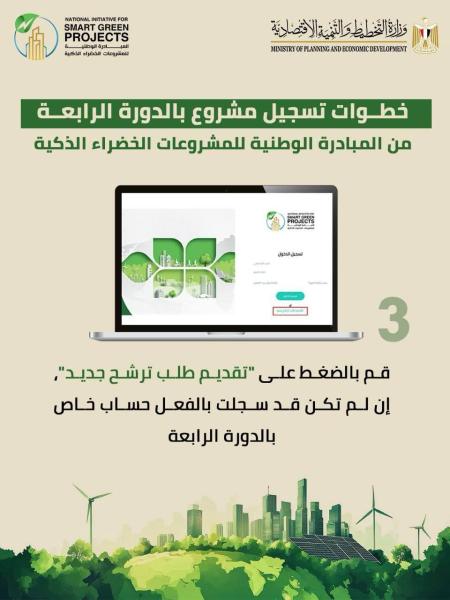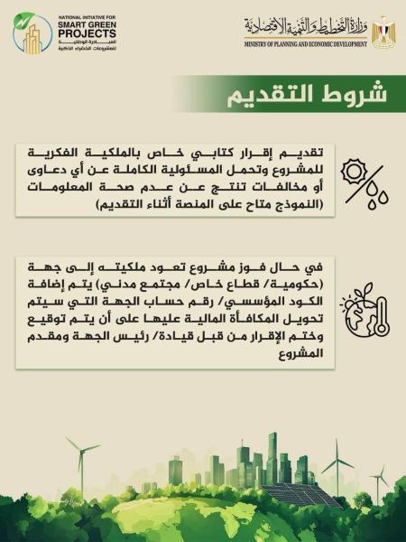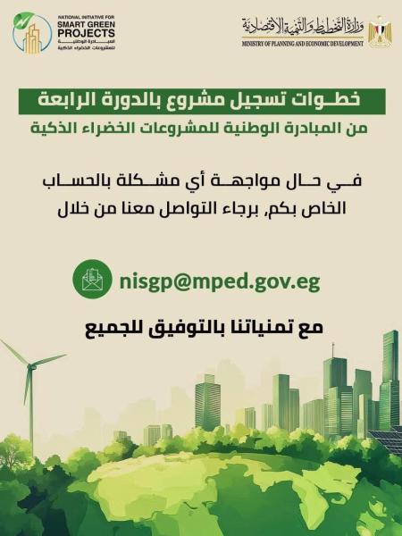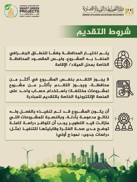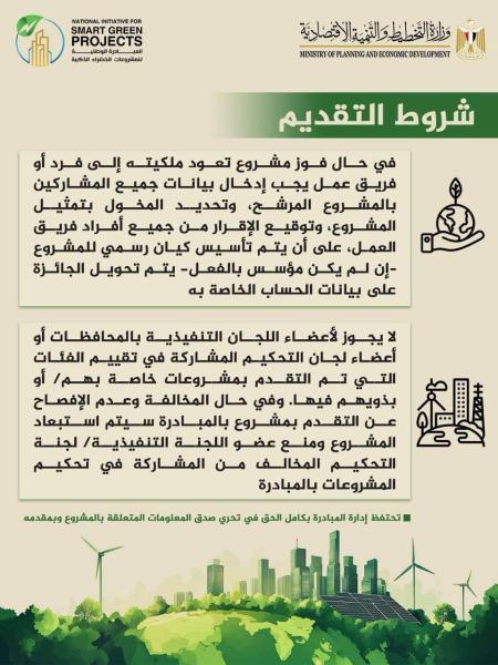 في إطار توجه الدولة نحو مواجهة تحديات تغير المناخ، وتعزيز مسار التنمية المستدامة، ودعم التحول نحو الاقتصاد الأخضر، تعلن وزارة التخطيط والتنمية الاقتصادية، بالتعاون مع وزارة التعليم العالي والبحث العلمي، ووزارة الاتصالات وتكنولوجيا المعلومات، ووزارة التنمية المحلية والبيئة، ووزارة التضامن الاجتماعي، بالإضافة إلى المجلس القومي للمرأة، عن فتح باب التقدم للمشاركة في الدورة الرابعة من المبادرة الوطنية للمشروعات الخضراء الذكية.