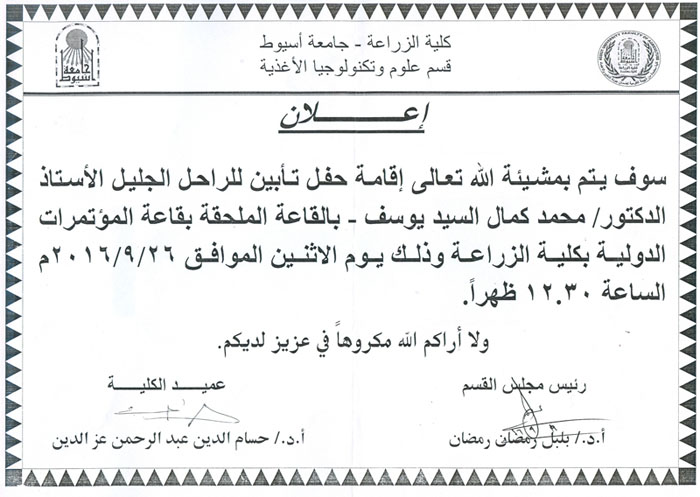 سوف يعقد بمشيئة الله تعالي اجتماع لجنة الدراسات العليا والبحوث بكلية الزراعة يوم الثلاثاء الموافق 20/9/2016م الساعة العاشرة صباحاًً بمكتب السيد الأستاذ الدكتور/ وكيل الكلية لشئون الدراسات العليا والبحوث.