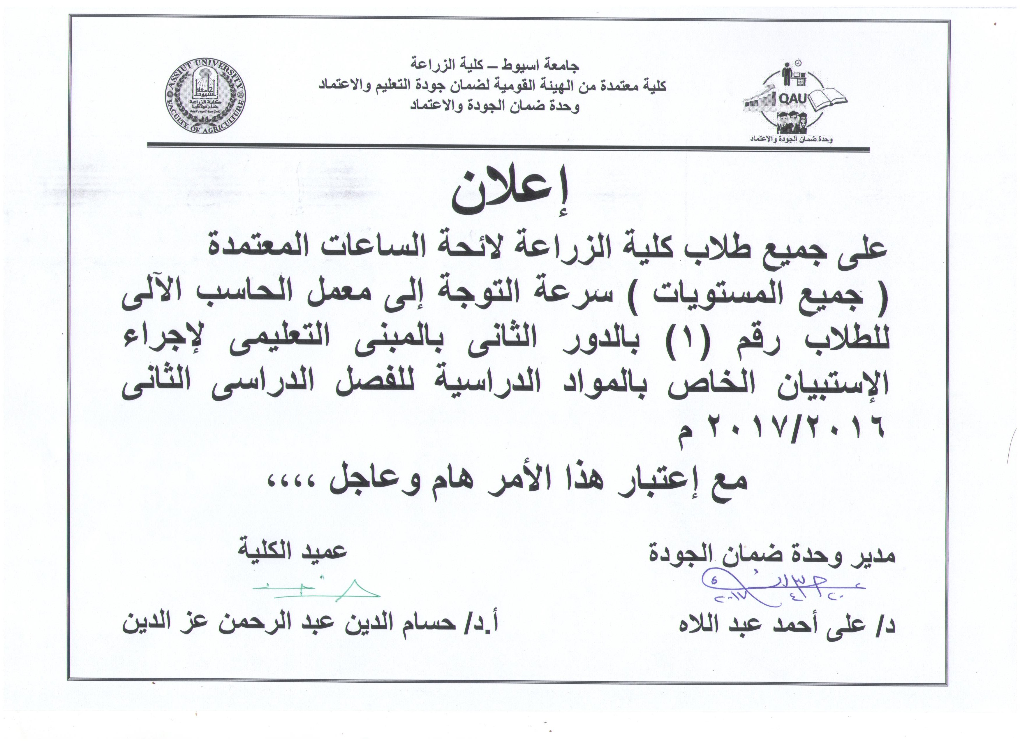 سيتم بمشيئة الله تعالى عقد سيمينار لتسجيل عنوان رسالة الماجستير للطالب / محمود حفظى محمد عبدالعزيز -المعيد والمسجل للحصول على درجة الماجستير فى العلوم الزراعية بقسم الأراضى والمياه -بكلية وذلك فى تمام الساعة الحادية عشر صباحاً يوم الأحد الموافق 2/4/2017 بقاعة السيمينار بالقسم.