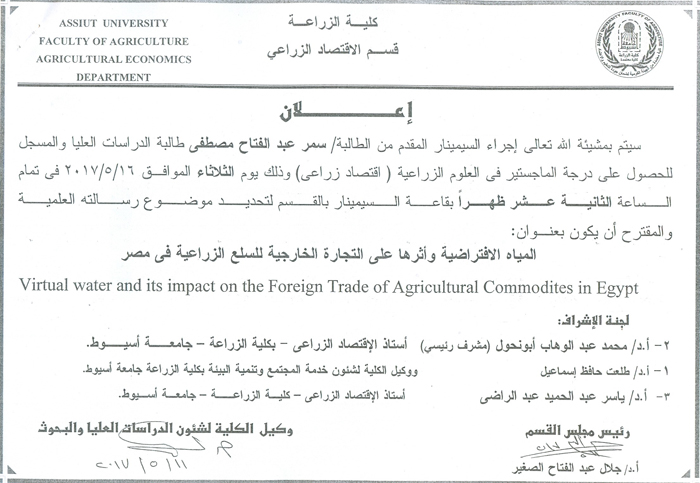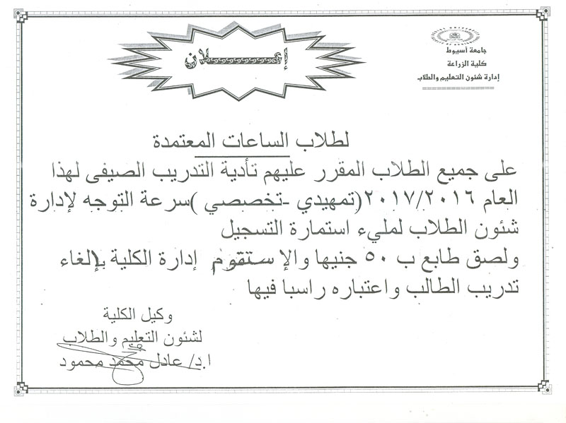 سوف يعقد بمشيئة الله تعالي اجتماع مجلس كلية الزراعة يوم الأحد الموافق 18/6/2017م الساعة الحادية عشر صباحاً وذلك بمقر مجلس الكلية – الدور الرابع (المبني الإداري).