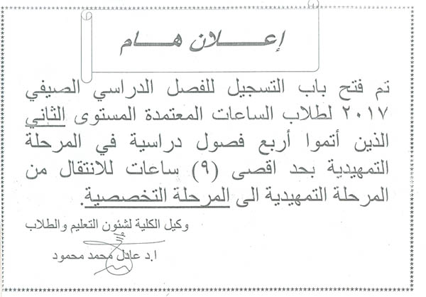 يتم فتح باب القيد لطلاب الدراسات العليا(ماجستير – دكتوراه) للعام الجامعى2017/2018 الفصل الدراسى الأول خلال الفترة من 1/8/2017 حتى 24/8/2017 .