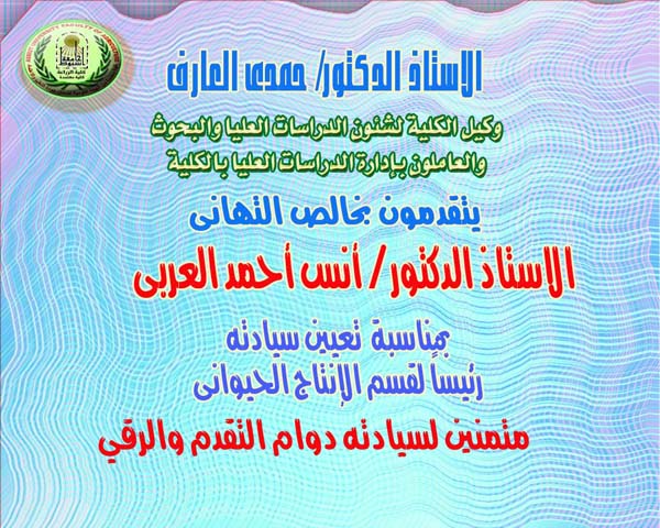تهنئة عميد الكلية لتعيين رئيس قسم الانتاج الحيوانى Read more about تهنئة عميد الكلية لتعيين رئيس قسم الانتاج الحيوانى تهنئة عميد الكلية لتعيين رئيس قسم الانتاج الحيوانى 3 أغسطس 2017